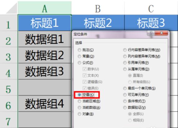 在定位條件頁(yè)面,點(diǎn)擊選擇"空值",然后點(diǎn)擊"確定"。