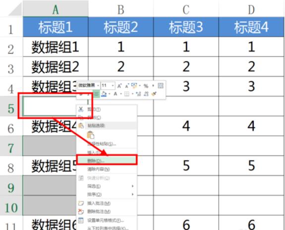 將鼠標光標移至選中的第一個(gè)空白單元格上方(注意:此時(shí)不要隨便使用鼠標胡亂點(diǎn)擊),鼠標右鍵單擊,點(diǎn)擊"刪除"。