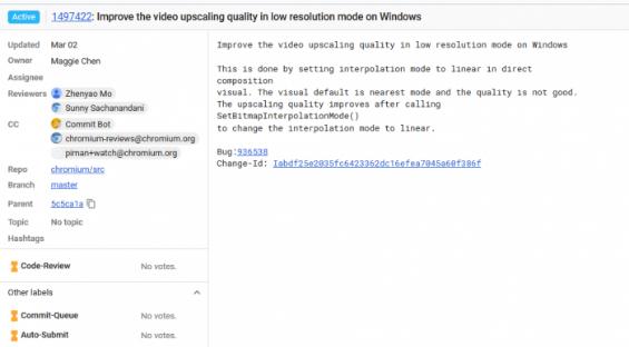 根據微軟工程師的建議,Chromium 的貢獻者 Maggie Chen 現在提交了一份解決此問(wèn)題的提交,并且可能會(huì )在未來(lái)的版本中推送到 Chrome 瀏覽器。Chen 在 Commit 中表示:“在調用 SetBitmapInterpolationMode 將過(guò)濾模式更改為 linear 之后,低分辨率模式的視頻質(zhì)量得到改善。目前相關(guān)的代碼尚未進(jìn)行審核。”