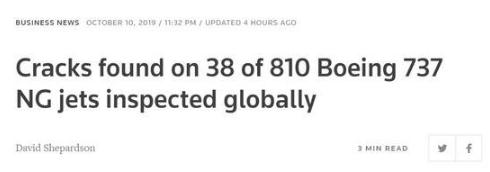 民航資源網(wǎng)2019年10月11日消息:據路透社報道,當地時(shí)間10月10日,波音公司表示在全球航司對810架737NG飛機檢查之后,發(fā)現有38架飛機存在結構性裂縫。裂縫涉及的是“撥叉”,為機翼與機身之間的連接部件,也是機翼與機身間的主要承重元件。737NG飛機是第三代737飛機版本。