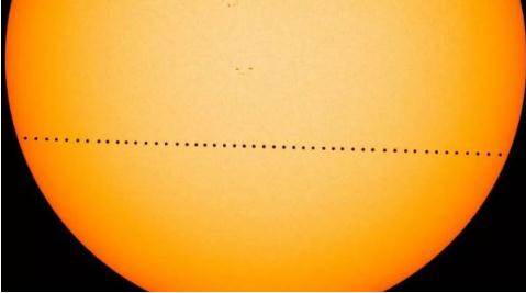 “水星凌日”現象平均每百年大約出現 13 次。當水星運行至地球和太陽(yáng)之間,如果三者能夠連成直線(xiàn),便會(huì )產(chǎn)生“水星凌日”現象。