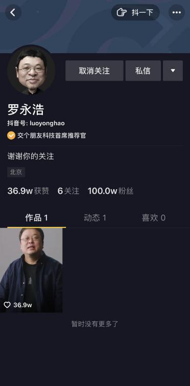 截至發(fā)稿,在不到 4 小時(shí)的時(shí)間里,首條視頻的點(diǎn)贊數已經(jīng)突破 37 萬(wàn),羅永浩的抖音粉絲突破百萬(wàn)。這或許是近來(lái)抖音粉絲增長(cháng)最快的賬號。