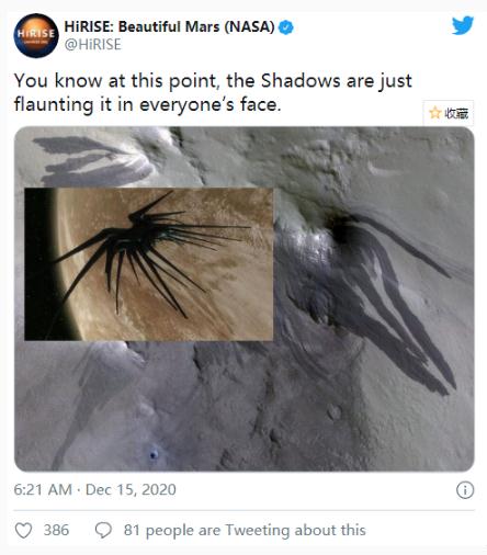 盡管大眼一看是隕石坑,周?chē)€有一些翅膀狀的陰影。HiRISE 官方賬號卻若有其是地將其和科幻劇集《巴比倫五號》中的邪惡反派“影族(Shadows)”的飛行器聯(lián)系起來(lái)。至少從配圖對比來(lái)看,的確有些相似。
