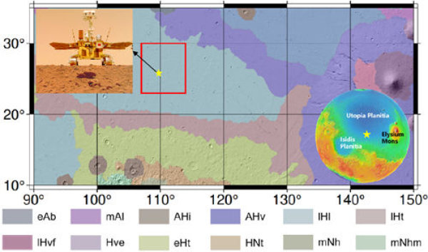 圖 1。“ 天問(wèn)一號”著(zhù)陸區及其周?chē)刭|(zhì)圖,“祝融號”(五角星)位于晚西方低地單元(修改自 Tanaka et al。, 2014)。 右下角 MOLA 全球高程圖指示著(zhù)陸區位于烏托邦平原南部,西臨伊西斯平原,東接埃律西昂火山