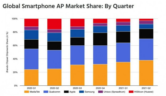 報告顯示 2021 年第 2 季度,蘋(píng)果在智能手機芯片組類(lèi)別中擁有 15% 的市場(chǎng)份額。與去年同期 13% 的份額相比,蘋(píng)果的市場(chǎng)份額實(shí)際上略有增加。而同期三星的市場(chǎng)份額只有 7%。