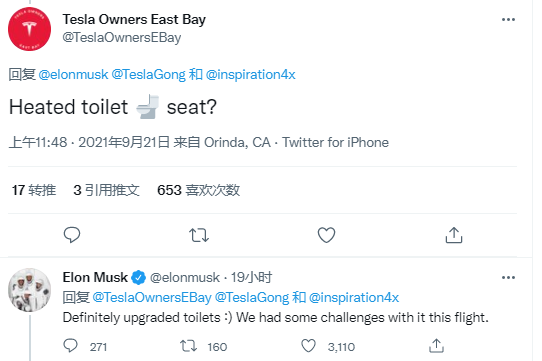 SpaceX 創(chuàng )始人埃隆·馬斯克(Elon Musk)周二發(fā)推文稱(chēng),Inspiration4 機組人員在上廁所時(shí)遇到了一些“挑戰”。他承諾為未來(lái)的任務(wù)進(jìn)行升級。