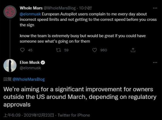 名為@WholeMarsBlog 的特斯拉車(chē)主發(fā)帖稱(chēng),歐洲許多特斯拉用戶(hù)抱怨稱(chēng),“Autopilot 不按規定限速,在通過(guò)交通標志前也沒(méi)有達到正確的速度。”馬斯克回應了這條推文,稱(chēng)特斯拉 Autopilot 團隊的目標是根據監管部門(mén)的批準,在明年 3 月份左右為非美國車(chē)主提供重大升級。