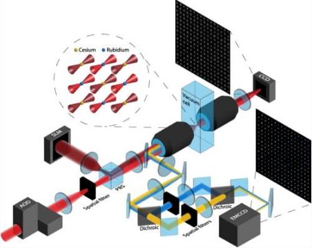 在由兩種不同元素的原子組成的混合陣列中,相鄰兩個(gè)原子可以是不同元素,具有完全不同的頻率。這使得研究人員更容易測量和操作單個(gè)原子,而不受周?chē)拥母蓴_。芝加哥大學(xué)團隊使用 512 個(gè)光鑷捕獲銣原子、銫原子各 256 個(gè),并觀(guān)察到兩個(gè)元素之間的干擾能夠忽略不計。