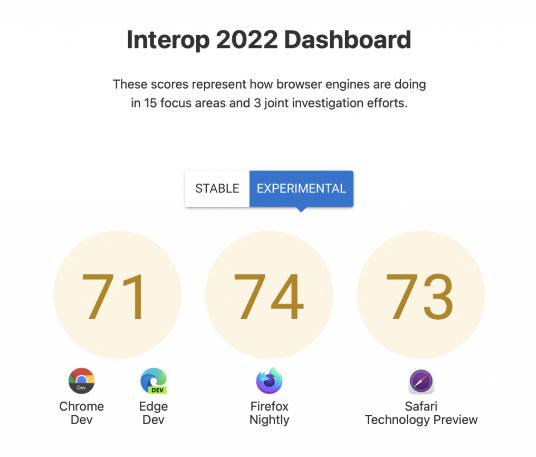 從根本上講,Interop 2022 是一個(gè)不斷發(fā)展的指標,用于評估各大瀏覽器對上述 Web 標準的兼容程度。Interop 2022 儀表板 有一個(gè)評分系統,評估各大瀏覽器的整體兼容程度: