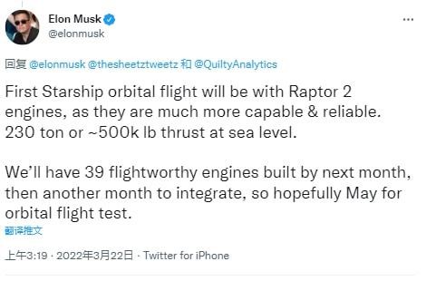 馬斯克在推特上表示:“到下個(gè)月,我們將制造出 39 個(gè)飛行引擎,然后再花一個(gè)月進(jìn)行整合,有望在 5 月份能進(jìn)行軌道飛行測試。”