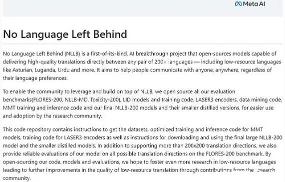 據悉,這項翻譯工作被 Meta 公司稱(chēng)作“無(wú)語(yǔ)言遺漏”(NLLB),旨在“減少全球范圍內的語(yǔ)言不平等”。