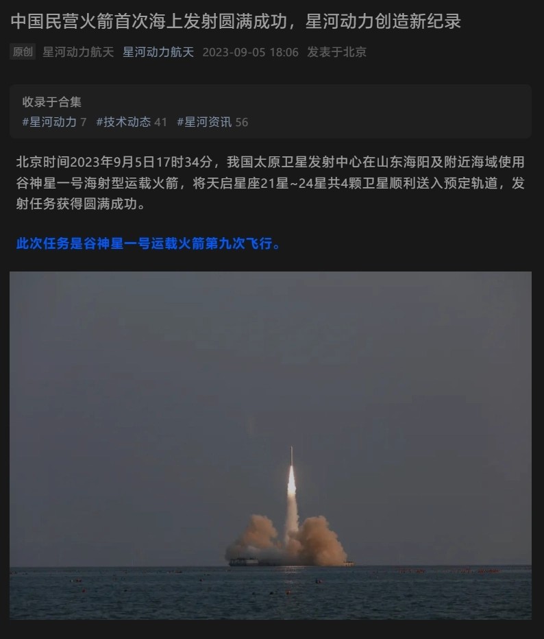 據星河動(dòng)力航天官方公眾號消息,星河動(dòng)力航天 9 月 5 日在山東海陽(yáng)及附近海域發(fā)射了谷神星一號海射型(遙一)運載火箭,將天啟星座 21-24 星送入 800 千米高的預定軌道,這是我國民營(yíng)火箭公司首次開(kāi)展海上發(fā)射任務(wù),并順利發(fā)射成功。