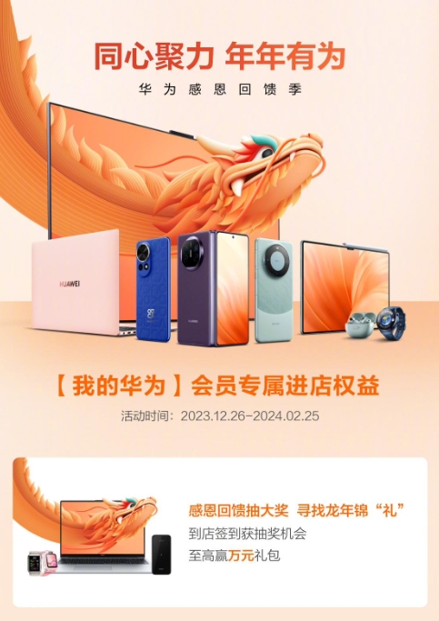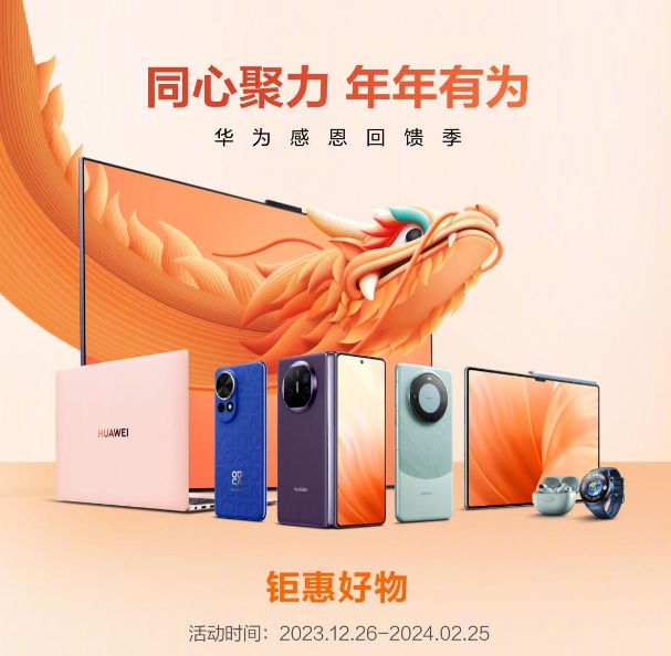 華為開(kāi)啟感恩回饋季,電腦、平板、智慧屏等產(chǎn)品至高優(yōu)惠 2000 元;服務(wù)門(mén)店同步開(kāi)啟備件 8.8 折等,活動(dòng)時(shí)間 2023 年 12 月 26 日-2024 年 2 月 25 日。
