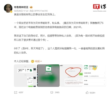 微信的文件傳輸助手是許多人常用的簡(jiǎn)單備份工具,但如果不注意,也可能給自己帶來(lái)麻煩。近日,一位網(wǎng)名為 @布魯克林奶王 的博主就在社交媒體上爆料了自己被騙的經(jīng)歷,引發(fā)網(wǎng)友熱議。