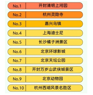 全國熱門(mén)景區 TOP10:開(kāi)封清明上河園、杭州靈隱寺、嘉興烏鎮、上海迪士尼、長(cháng)沙橘子洲景區、北京環(huán)球影城、北京天壇公園、開(kāi)封萬(wàn)歲山武俠城景區、北京動(dòng)物園、杭州西湖風(fēng)景名勝區。